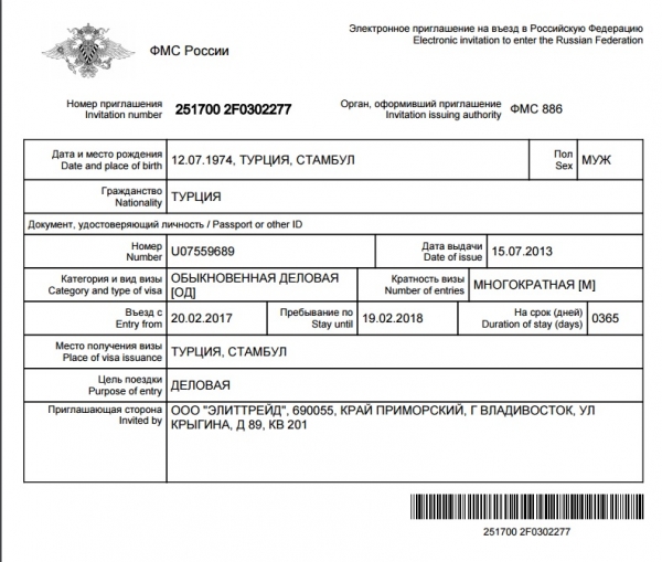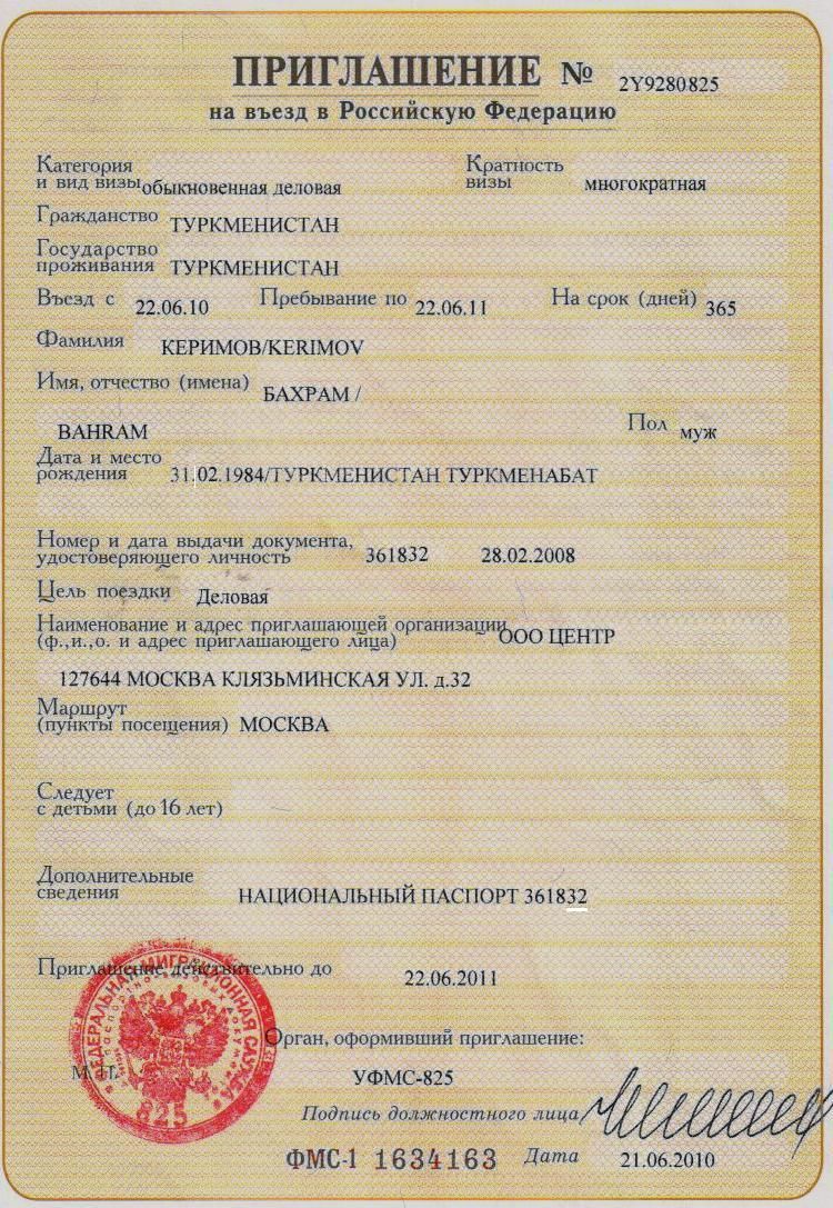 • Should be issued by the local department of the Russian Migration police (former FMS) upon the request of Russian accredited companies. Is submitted to the Consulate in original on a stamped form (so-called Yellow page) Sample